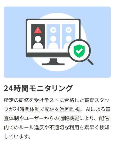 監視は、研修と審査をクリアした専門スタッフによる目視確認と、AIを活用した自動監視を組み合わせた二重体制です。これにより、配信中の不適切な行為や利用規約に違反する発言などが即座に検知され、必要に応じて配信停止やアカウント制限といった対応が取られます。